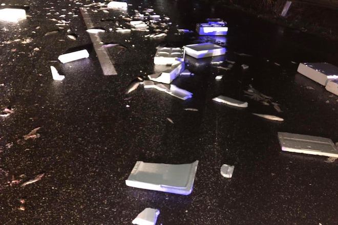 Την ίδια στιγμή, γέμισε όλη η Εθνική ψάρια. Στο σημείο έσπευσε και συνεργείο της Αντιδημαρχίας Καθαριότητας για να καθαρίσει το οδόστρωμα.