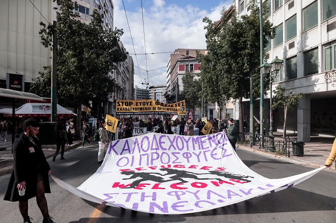 “Από τα Τέμπη στο Αιγαίο δολοφονούν εργάτες, φοιτητές, μετανάστες, ανοίξτε τα σύνορα στη φυλακή οι φασίστες” ήταν το κεντρικό σύνθημα της διαδήλωσης.