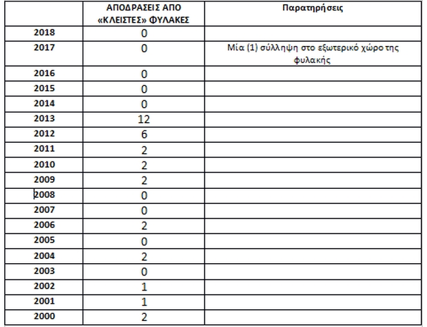 Επισημαίνεται, επίσης, ότι ειδικά για το χρονικό διάστημα των εορτών έχουν δοθεί ρητές εντολές στα Καταστήματα Κράτησης από το Υπουργείο (στις 11 Δεκεμβρίου 2018, στις 19 Δεκεμβρίου 2018 και στις 27 Δεκεμβρίου 2018) για «επίταση των μέτρων ασφαλείας» προκειμένου να αποτραπούν κάθε είδους έκνομες ενέργειες. Ας σημειωθεί, τέλος, ότι από το 2015 μέχρι σήμερα, και παρά τις αντίθετες «Κασσάνδρες», η σημερινή απόδραση είναι η πρώτη που συμβαί νει από κλειστή φυλακή, σε αντίθεση με τα προηγούμενα έτη (βλ. πίνακα).