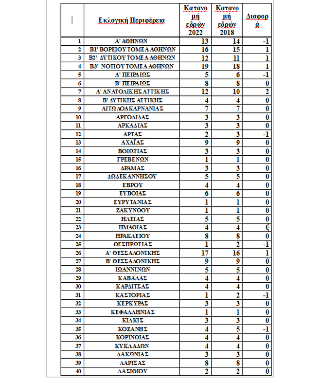 Με βάση την τελευταία κατανομή εδρών, όπως διαμορφώθηκε με το Προεδρικό Διάταγμα 117/2018 – ΦΕΚ 225/Α/31-12-2018, δύο έδρες κερδίζει η εκλογική Περιφέρεια της Ανατολικής Αττικής ενώ από μία έδρα κερδίζουν ο Βόρειος, ο Δυτικός και ο Νότιος τομέας Αθηνών καθώς και η Α΄ εκλογική Περιφέρεια της Θεσσαλονίκης.