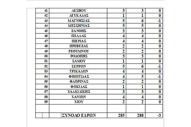 Αντίθετα, από μία έδρα χάνουν οι εκλογικές Περιφέρειες Α΄ Αθηνών, Α΄ Πειραιώς, Άρτας, Κοζάνης, Μαγνησίας, Σερρών, Φθιώτιδας, Θεσπρωτίας και Καστοριάς. Μάλιστα οι δύο τελευταίες Περιφέρειες καθίστανται μονοεδρικές.