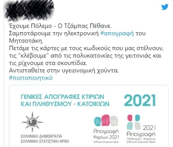 Σε άλλες θεωρίες, η απογραφή διασυνδέεται με “φακέλωμα” αντιεμβολιαστών, διακινούμενες από ανθρώπους που φυσικά έχουν τα περασμένα χρόνια δώσει μπόλικα προσωπικά τους στοιχεία στα social media και σε άλλες υπηρεσίες.
