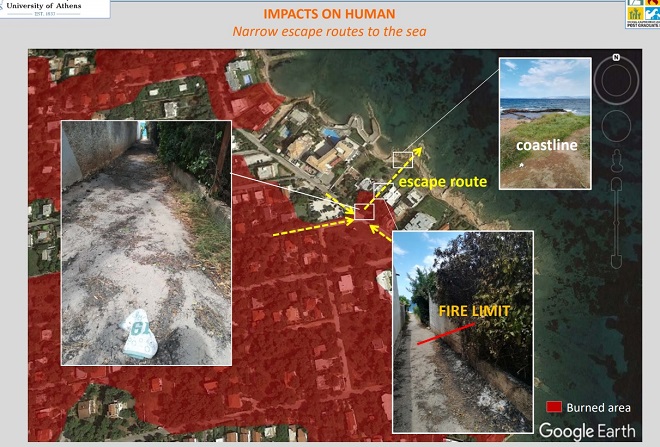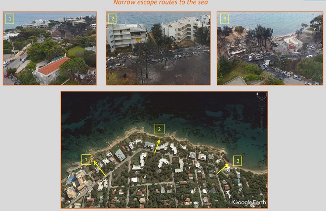 Μάλιστα, συγκλονίζουν οι ανύπαρκτες δίοδοι εξόδου για τους πολίτες οι οποίοι εγκλωβίστηκαν, με αποτέλεσμα να βρουν φρικτό θάνατο, και η αποτύπωση με τα 35 εγκαταλειμμένα σε συμφόρηση και σε πολύ μικρό χώρο, καμένα αυτοκίνητα.