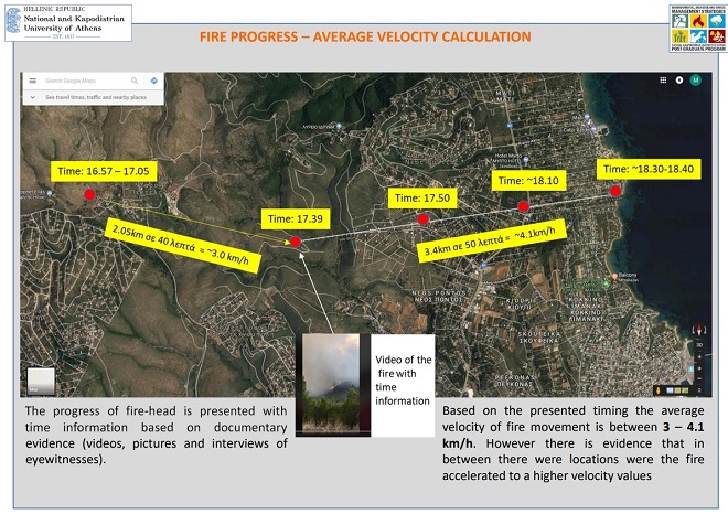 Μεταξύ των άλλων η ομάδα του καθηγητή κ. Ευθύμη Λέκκα αναλύει το χρονολόγιο της κατεύθυνσης και της έντασης των ανέμων, αποτυπώνει το μέγεθος της έκτασης που κάηκε, αλλά και την ταχύτητα του πύρινου μετώπου.