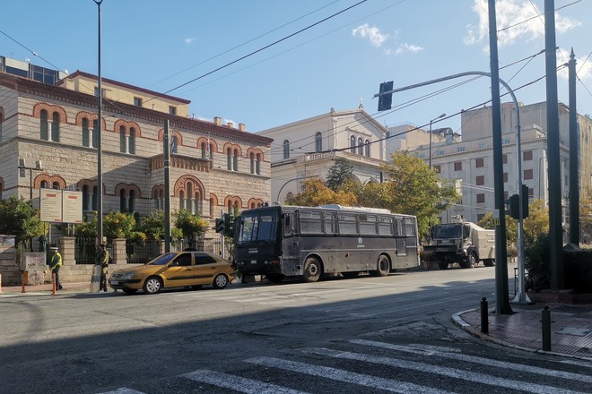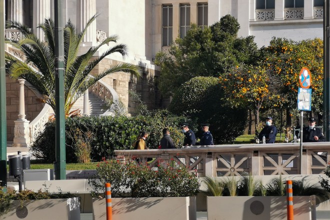 Δυνάμεις της Αστυνομίας πραγματοποιούν ελέγχους στα στενά επί της Ακαδημίας και της Πανεπιστημίου, στα Προπύλαια, στην Ομόνοια και στην Χαλκοκονδύλη.