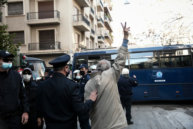 Παράλληλα, στην οδό Ναυαρίνου, συγκεντρώθηκαν 30 μέλη του Σοσιαλιστικού Εργατικού Κόμματος, με σημαίες, μάσκες και αποστάσεις μεταξύ τους. Η Αστυνομία έκλεισε τις διόδους επί της Τρικούπη και της Μαυρομιχάλη, ώστε να μην τους επιτρέψει να φύγουν, ενώ προχώρησε στην προσαγωγή μελών.