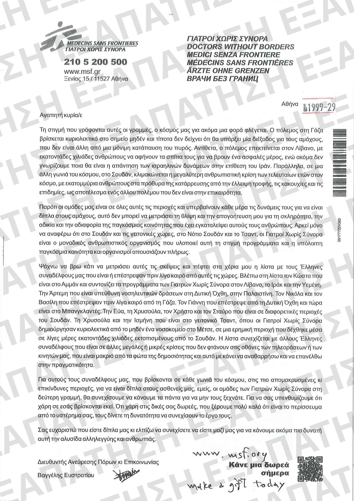 Πιο συγκεκριμένα, το άτομο αυτό αποστέλλει επιστολές σε Ελλάδα και εξωτερικό χρησιμοποιώντας ψευδώς την ιδιότητα ανώτατου στελέχους μας, (Διευθυντής Ανεύρεσης Πόρων και Επικοινωνίας), ζητώντας δωρεές σε προσωπικό του τραπεζικό λογαριασμό.