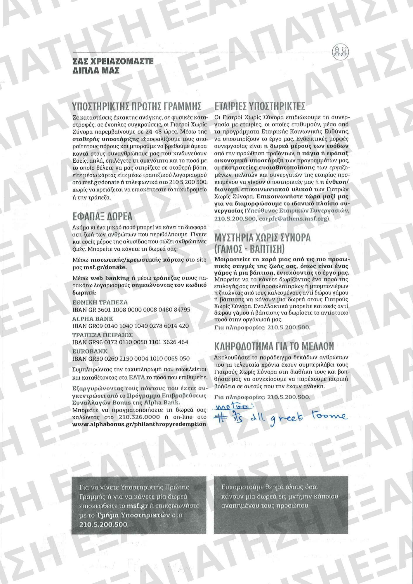 Οι Γιατροί Χωρίς Σύνορα δεν ζητούν ποτέ δωρεές σε προσωπικούς λογαριασμούς αλλά μόνο σε λογαριασμούς της οργάνωσης που είναι διαθέσιμοι στο msf.gr.