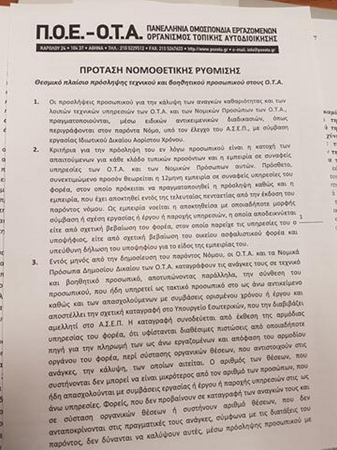 Στην πρόταση νομοθετικής ρύθμισης που παρουσίασε η ΠΟΕ-ΟΤΑ και την οποία σκοπεύει να παραδώσει στον υπ. Εσωτερικών κ. Πάνο Σκουρλέτη στις 12:30 το μεσημέρι της Δευτέρας,  προβλέπονται προσλήψεις προσωπικού για την κάλυψη αναγκών καθαριότητας μέσω ειδικών αντικειμενικών διαδικασιών υπό τον έλεγχο του ΑΣΕΠ.