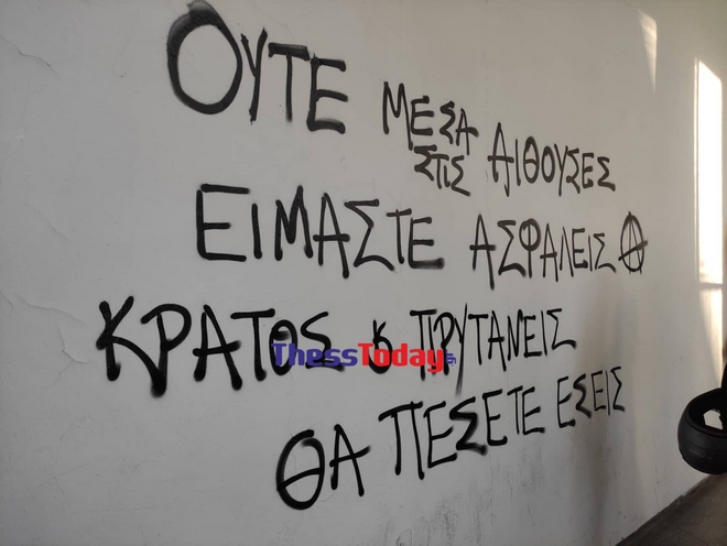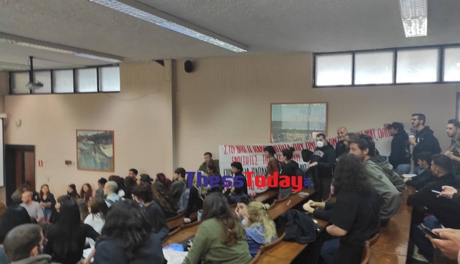 Παράλληλα οι φοιτητές ανήρτησαν πανό μέσα στην αίθουσα και ζήτησαν τη δημιουργία περισσότερων τμημάτων και προσλήψεις καθηγητών, αναφέρει το Thesstoday.