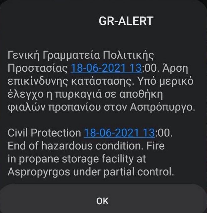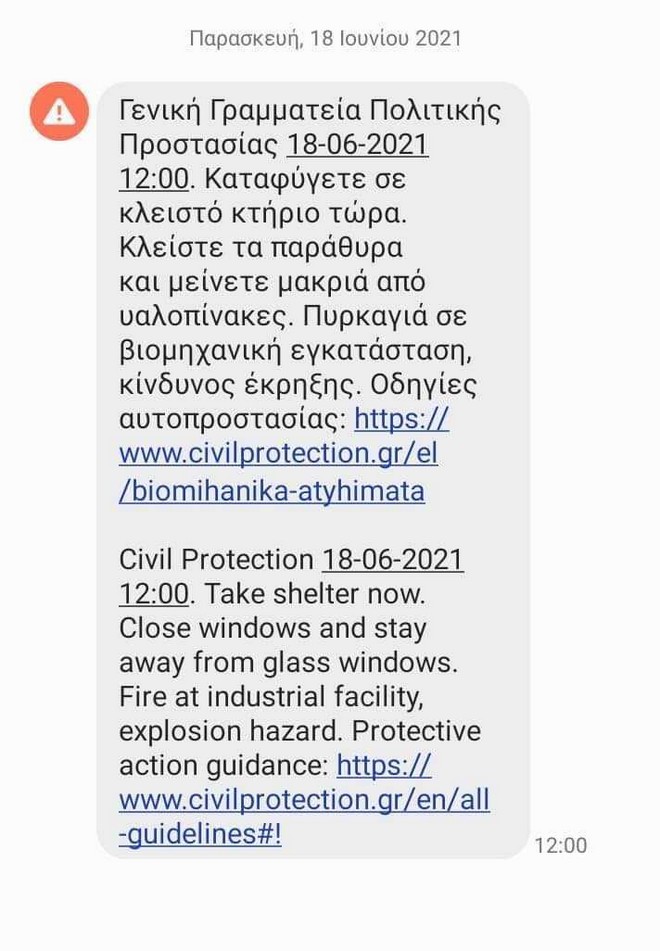 Συγκεκριμένα το μήνυμα ανέφερε: “Καταφύγετε σε κλειστό κτήριο τώρα. Κλείστε τα παράθυρα και μείνετε μακριά από υαλοπίνακες. Πυρκαγιά σε βιομηχανική εγκατάσταση, κίνδυνος έκρηξης”.