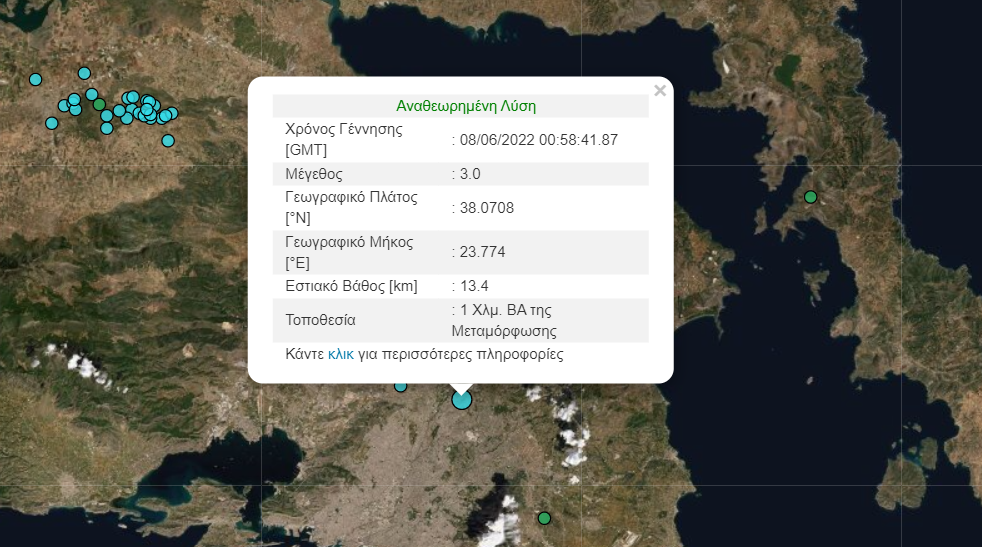Σεισμός 3 βαθμών Ρίχτερ σημειώθηκε τα ξημερώματα της Τετάρτης στην Αττική. Το επίκεντρο εντοπίστηκε 1 χιλιόμετρο βορειοανατολικά της Μεταμόρφωσης.
