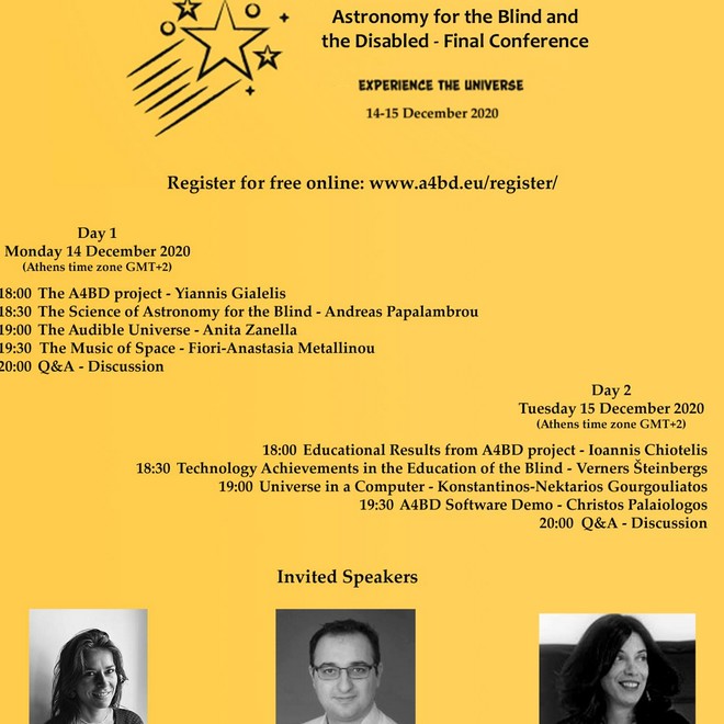 Στο παραπάνω διήμερο συγκεντρώνονται και παρουσιάζονται τα αποτελέσματα του έργου A4BD (Astronomy for the Blind and the Disabled) το οποίο εκπονήθηκε στο διάστημα 2017 -2020 με συντονιστή το Πανεπιστήμιο Πατρών, σε συνεργασία με εκπαιδευτικούς φορείς και ειδικά σχολεία από την Ισπανία, τη Γαλλία, την Πολωνία, την Ελλάδα, τη Λετονία και την Κύπρο.