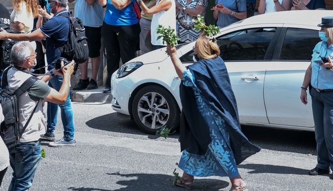 H Μαρίζα Κωχ με κλαδιά βασιλικού έξω από το σπίτι του Μίκη Θεοδωράκη Eurokinissi