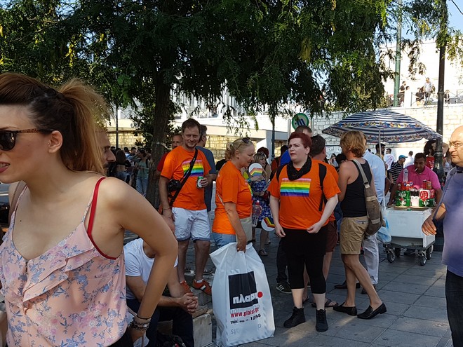 Ουρές κόσμου περίμεναν να βαφτούν με τα χρώματα του ουράνιου τόξου -σύμβολο της ΛΟΑΤΚΙ κοινότητας- με τη «ζωγραφική προσώπου» (face painting). Πιο δίπλα, άλλοι τύπωναν πλακάτ, μπλουζάκια και τσάντες με φράσεις, όπως «Ούτε αγόρι, ούτε κορίτσι απλώς άνθρωπος», «Δεν είναι μια φάση», «Είμαι γκέι και σας καίει».