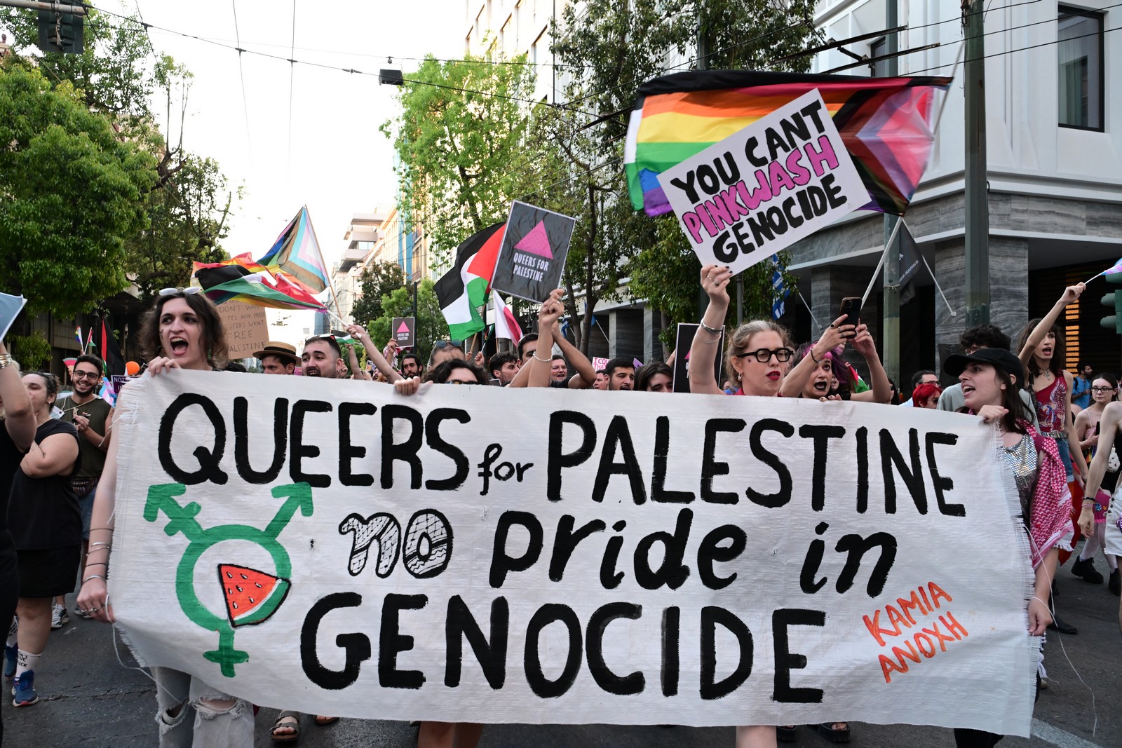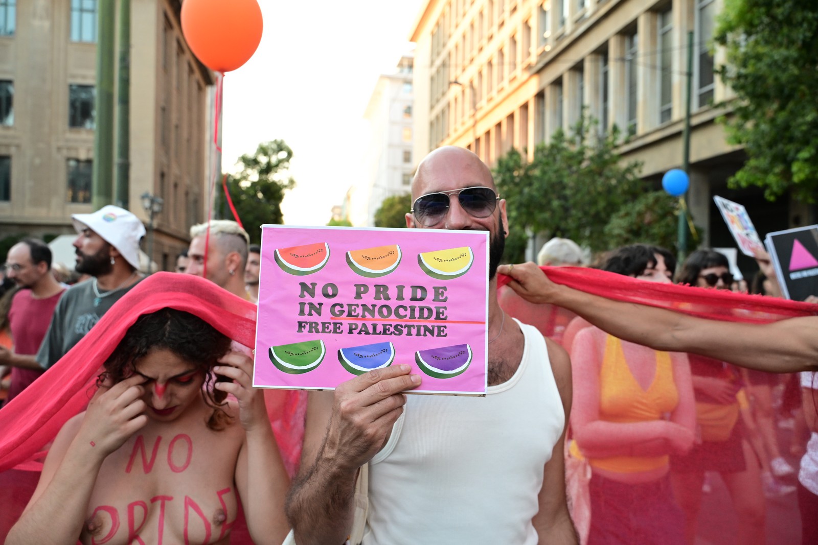 Η σφαγή στην Παλαιστίνη είχε τη δική της θέση στην πορεία υπερηφάνειας, με πανό, συνθήματα για “λευτεριά στην Παλαιστίνη” και το αίτημα για κατάπαυση του πυρός στη Γάζα.