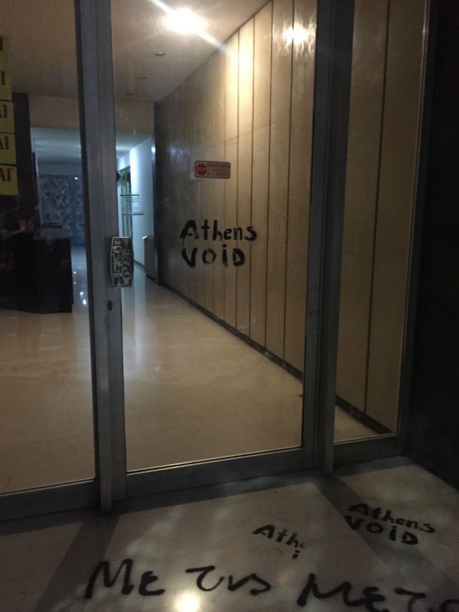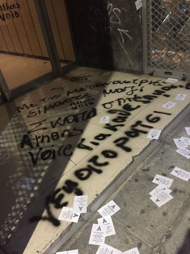 Άγνωστοι έγραψαν συνθήματα στην είσοδο του κτιρίου όπου στεγάζονται τα γραφεία της Athens Voice στο κέντρο της Αθήνας και πέταξαν φυλλάδια