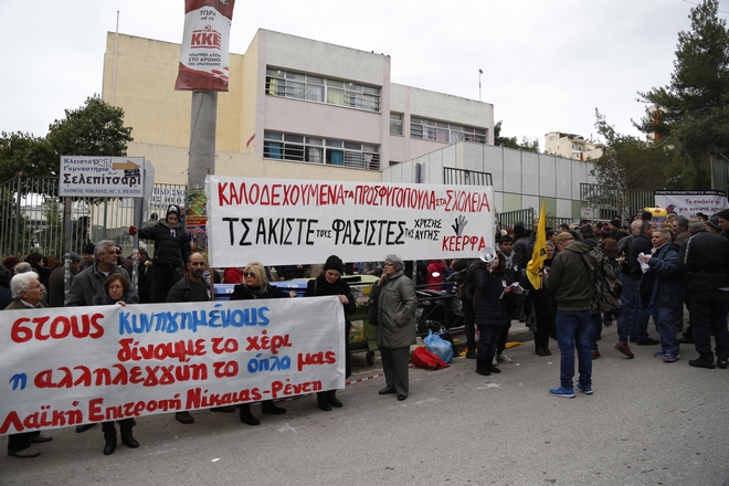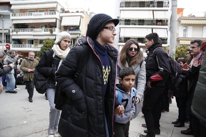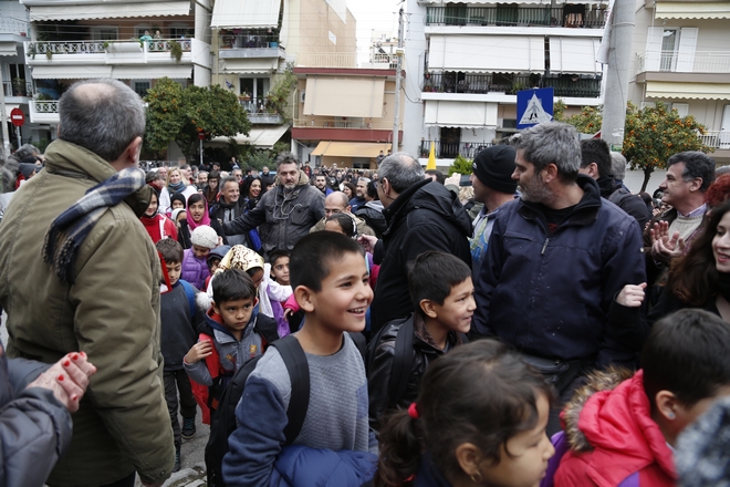 Υποδοχή προσφυγόπουλων στο 15ο Δημοτικό Σχολείο της Νίκαιας την Τρίτη 31 Ιανουαρίου 2017. Τα συνολικά 27 προσφυγόπουλα που θα φοιτήσουν στο σχολείο υποδέχθηκαν με χειροκροτήματα, γονείς παιδιών που φοιτούν ήδη στο Δημοτικό, συλλογικότητες αλλά και τοπικοί φορείς. (EUROKINISSI/ΣΤΕΛΙΟΣ ΜΙΣΙΝΑΣ) Eurokinissi