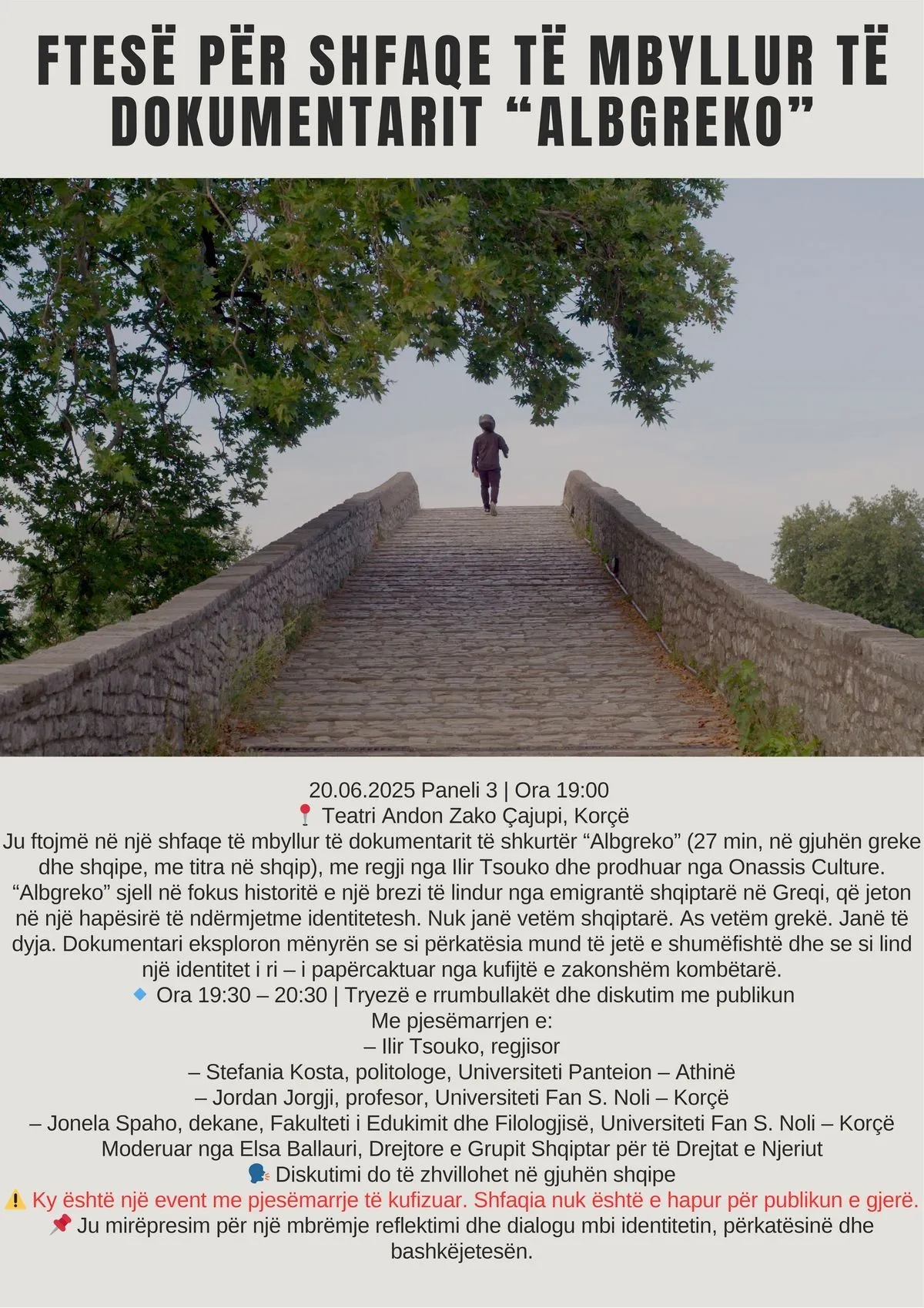 Στο πλαίσιο του συνεδρίου εκεί θα γίνει και μια avant premiere της ταινίας «Και Ελ και Αλ» στα αλβανικά και αγγλικά «Αlbgreco» πριν την επίσημη πρώτη της στο φεστιβάλ των Τιράνων το Σεπτέμβρη.