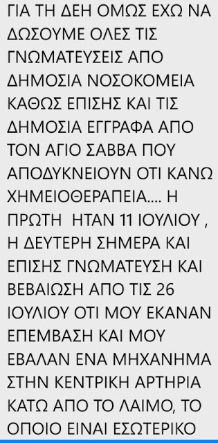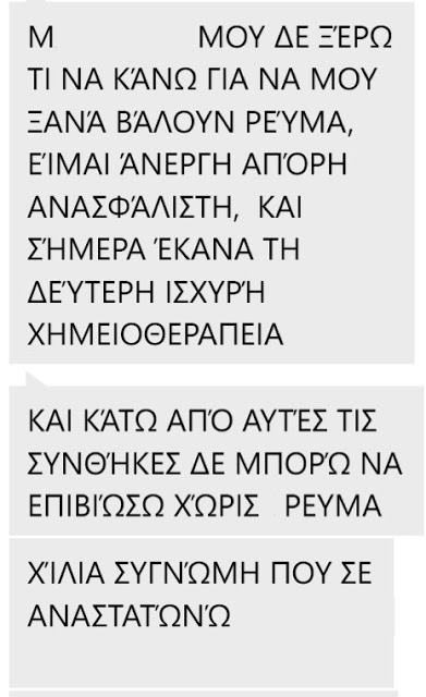Παρακάτω αναρτούμε την αγωνιώδη έκκληση μιας νέας κοπέλας, άνεργης, με καθολικό λέμφωμα, που γυρίζοντας από την χημειοθεραπεία που έκανε στο Νοσοκομείο βρήκε το ρεύμα της κομμένο.