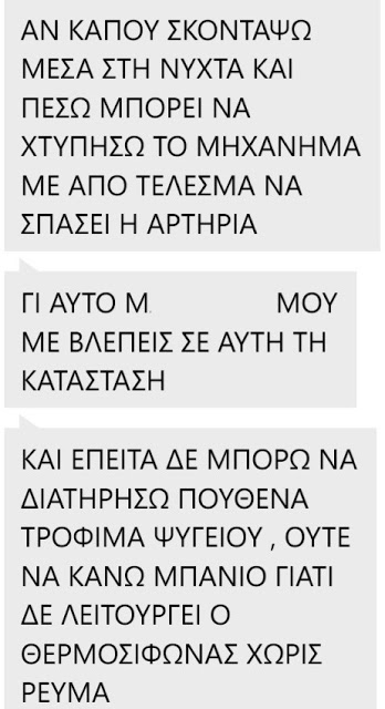 Η κοπέλα μας έστειλε τα παρακάτω μηνύματα, φτάνοντας στα πρόθυρα αυτοκτονίας. Πολλοί συναγωνιστές του Κινήματος Δεν Πληρώνω  μίλησαν μαζί της , δίνοντας της κουράγιο και οι διαδικασίες επανασύνδεσης δρομολογήθηκαν άμεσα”.