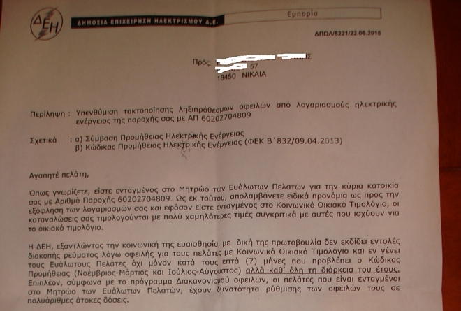 “Από την άλλη, υπάρχουν και καταναλωτές που δεν είναι στο κοινωνικό τιμολόγιο για πολλούς και διάφορους λόγους αλλά δεν ευημερούν. Μπορεί ας πούμε να είναι το εισόδημα τους 12.000 και ένα ευρώ αλλά να είναι πολύτεκνοι. Ένας πολύτεκνος με υποχρεώσεις, προηγούμενα δάνεια και τέσσερα παιδιά για παράδειγμα, ενδεχομένως θα δυσκολεύεται. Σε αυτούς δεν στέλνουν ειδοποίηση πως αν δεν κάνετε ρύθμιση θα προβούμε σε αναγκαστικά μέτρα είσπραξης, αλλά έχουν στείλει επιστολές από εισπρακτικές εταιρείες και έχω λάβει στα χέρια μου πολλές τέτοιες από ανθρώπους που μου τις αποστέλλουν μέσα στην απόγνωση τους. Σε αυτούς που έχουν αφήσει τους λογαριασμούς και έχουν φτάσει πάνω από 1.500 ευρώ στέλνουν επιστολές μέσω εισπρακτικών και τους δίνουν προθεσμία”.