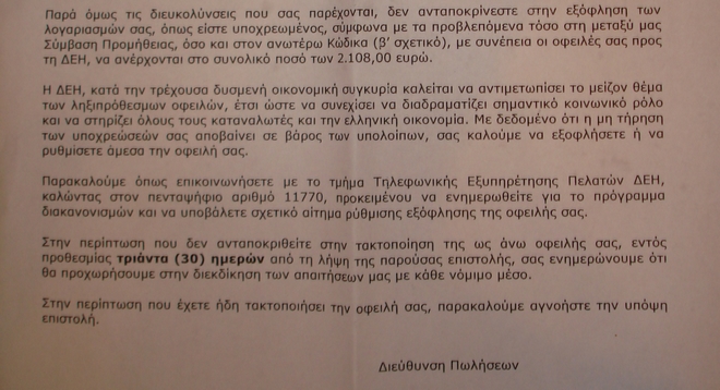“Η αποστολή τέτοιου είδους επιστολών, κάθε άλλο παρά αναδεικνύει το “’κοινωνικό πρόσωπο” της ΔΕΗ και της κυβέρνησης, αντίθετα επιβεβαιώνει τις υποψίες μας ότι η συνέχεια ενός ανάλγητου κράτους με αξιακό πρόθεμα την προάσπιση νεοφιλελεύθερων πολιτικών που αναδεικνύουν τους αριθμούς πάνω από την ανθρώπινη υπόσταση Υπερηφάνεια και Αξιοπρέπεια, δηλώνει παρόν και μάλιστα με “πάταγο”.