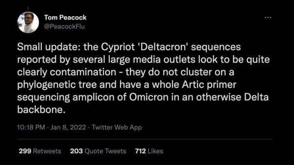 “Σχετικά με το Deltacron (ανάμιξη Delta και Omicron) της Κύπρου που ακούστηκε πολύ στα ελληνικά ΜΜΕ πρόσφατα, οι πρώτες ανεξάρτητες αναλύσεις δείχνουν ότι πρόκειται για τεχνικό λάθος του εργαστηρίου στην διαδικασία διαβάσματος του γονιδιώματος…” έγραψε χαρακτηριστικά.