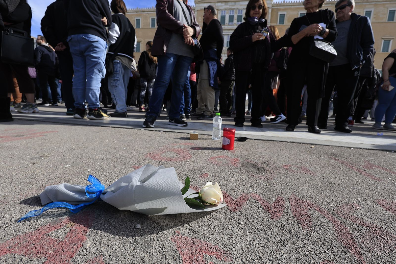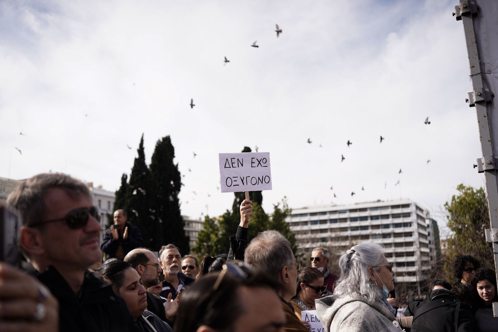 Συλλαλητήριο στην πλατεία Συντάγματος για το σιδηροδρομικό δυστύχημα στα Τέμπη, με συνθήματα "Δεν έχω οξυγόνο" και "Κανένα έγκλημα χωρίς τιμωρία", από τον "Σύλλογο Πληγέντων Δυστυχήματος Τεμπών", Κυριακή 26 Ιανουαρίου 2025. Όπως τονίζεται στην ανακοίνωση που ανάρτησαν οι συγγενείς των θυμάτων, ζητούν την άμεση έρευνα για την έκρηξη του παράνομου χημικού φορτίου και τη φωτιά που έκαψε ζωντανά 30 άτομα, τα οποία είχαν επιζήσει από τη μοιραία σύγκρουση, ενώ αίτημά τους είναι να δοθούν εξηγήσεις από τον υποψήφιο Πρόεδρο της Δημοκρατίας, Κωνσταντίνου Τασούλα "για το θάψιμο των δικογραφιών για τα Τέμπη στα συρτάρια της Βουλής". (ΓΙΩΡΓΟΣ ΚΟΝΤΑΡΙΝΗΣ/EUROKINISSI)