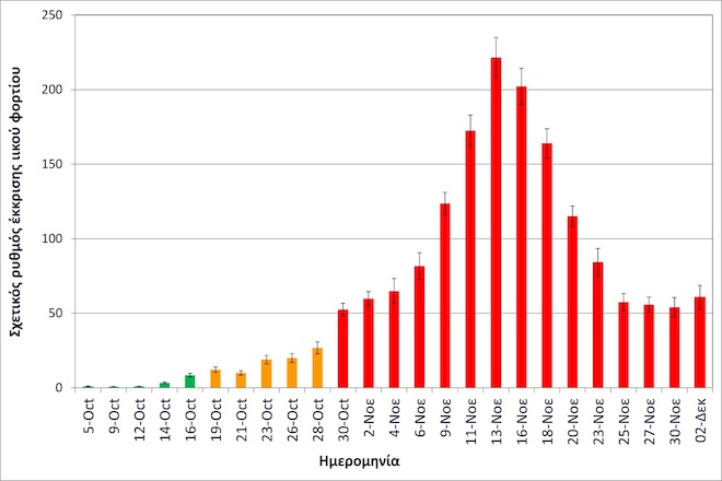 Στον συνημμένο διάγραμμα, που δημοσιεύει το ΑΠΕ-ΜΠΕ, οι ημέρες των δειγματοληψιών, που καταγράφονται με κόκκινο χρώμα αντιστοιχούν σε περισσότερα από 500 κρούσματα – όπως ανακοινώθηκαν τις αντίστοιχες ημέρες από τον ΕΟΔΥ – οι μέρες που καταγράφονται με πορτοκαλί σε 100-400 κρούσματα και οι μέρες που καταγράφονται με πράσινο σε λιγότερα από εκατό κρούσματα.