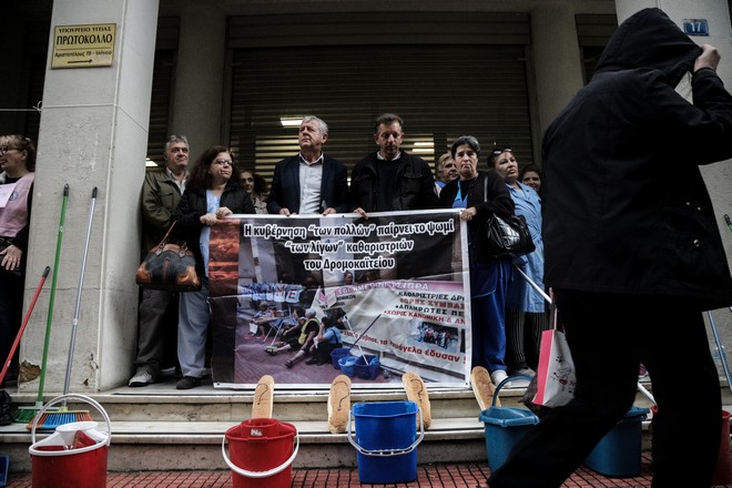 Επίσης, μπροστά από την είσοδο τοποθέτησαν κουβάδες και σκούπες, καθώς και ένα πανό με το σύνθημα: “Η κυβέρνηση “των πολλών” παίρνει το ψωμί “των λίγων” καθαριστριών του Δρομοκαΐτειου”.