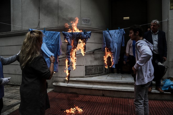 Συμβολικά τοποθέτησαν στην είσοδο του υπουργείου φραντζόλες με ψωμί, θέλοντας να καταδείξουν ότι χάνουν το ψωμί τους, ενώ στο ίδιο σημείο κρέμασαν τις ποδιές τους, στις οποίες έγραφαν τη λέξη “ανεργία” και τους έβαλαν φωτιά.