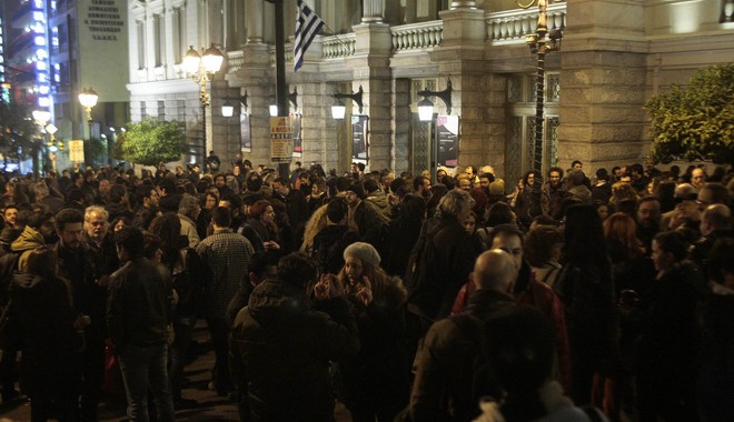 Συγκέντρωση διαμαρτυρίας έξω από το Εθνικό Θέατρο για την απόφαση να κατέβει η παράσταση "Ισορροπία του Nash" με κείμενα του Σάββα Ξηρού την Παρασκευή 29 Ιανουαρίου 2016. Στη συνέχεια οι διαμαρτυρόμενοι έκαναν πορεία προς το REX. (EUROKINISSI/ΣΤΕΛΙΟΣ ΣΤΕΦΑΝΟΥ) Eurokinissi