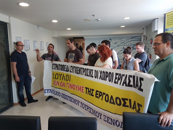 Το συνδικάτο επισιτισμού Τουρισμού ξενοδοχείων μπήκαν αιφνιδιαστικά σε εταιρία ενοικίασης εργαζομένων και πραγματοποίησαν παρέμβαση. Παράλληλα κάλεσαν σε απεργία στις 20 Ιουλίου. Αιφνιδιαστική παρέμβαση και στο Χίλτον