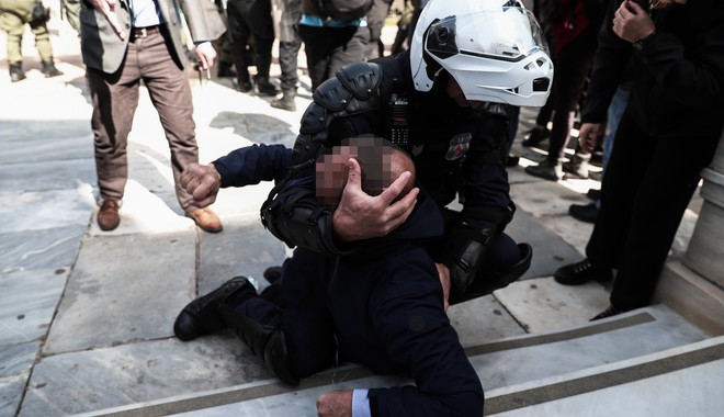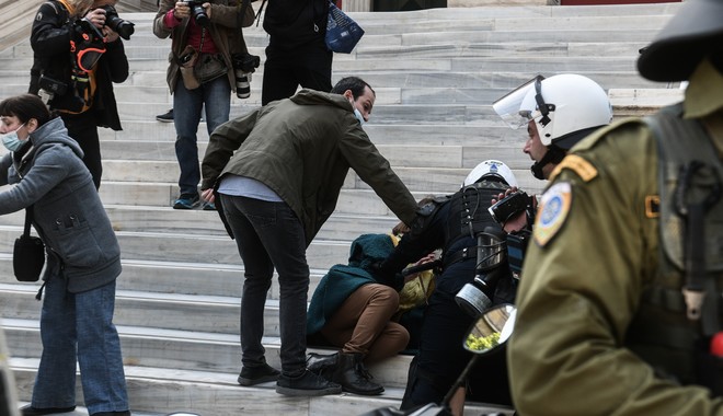 Αστυνομικοί εμφανίζονται να αρπάζουν πανό από τους διαδηλωτές, να κάνουν χρήση χημικών, την ώρα που το υδροβόλο όχημα πετούσε νερό στο πλήθος. Ακολούθησε κυνηγητό στα στενά γύρω από την πλατεία Συντάγματος, με τους συγκεντρωμένους να διαχωρίζονται προς τις οδούς Ερμού, Καραγιώργη Σερβίας και Σταδίου.