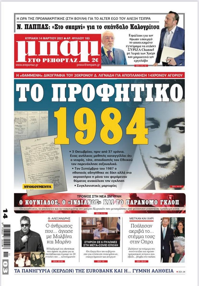 Η εφημερίδα φέρνει στο φως τη δικογραφία αλλά και άγνωστες πτυχές της σύλληψης του Δημήτρη Λιγνάδη το 1984 για αποπλάνηση ενός 14χρονου αγοριού. Στις 3 Οκτωβρίου 1984 ο μαθητής Δ.Π. πηγαίνει, τρέχοντας, σπίτι του και καταγγέλλει στην μητέρα του ότι του επιτέθηκε σεξουαλικά ένας μεγαλύτερος άντρας, ηλικίας 20 ετών. Λίγη ώρα αργότερα μάνα και γιος βρίσκονται στο Αστυνομικό Τμήμα στρεφόμενοι, μέσω έγκλισης, κατά ενός εικοσάχρονου φοιτητή φιλολογίας, σπουδαστή της δραματικής σχολής του εθνικού θεάτρου. Λίγη ώρα αργότερα ο φερόμενος ως θύτης συλλαμβάνεται. Πρόκειται για το Δημήτρη Λιγνάδη! Τρία χρόνια μετά και συγκεκριμένα στις 24 Σεπτεμβρίου 1987 υπόθεση φτάνει στο ακροατήριο.