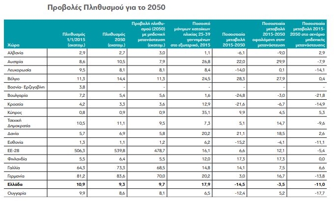 Το 2050 ο πληθυσμός της χώρας υπολογίζεται ανάμεσα στα 10 εκατομμύρια, σύμφωνα με το πιο αισιόδοξο σενάριο και στα 8,3 εκατομμύρια, με βάση την πιο απαισιόδοξη πρόβλεψη, που σημαίνει μία ελάττωση του πληθυσμού από 800 χιλιάδες έως 2,5 εκατομμύρια ανθρώπους.