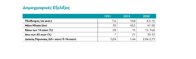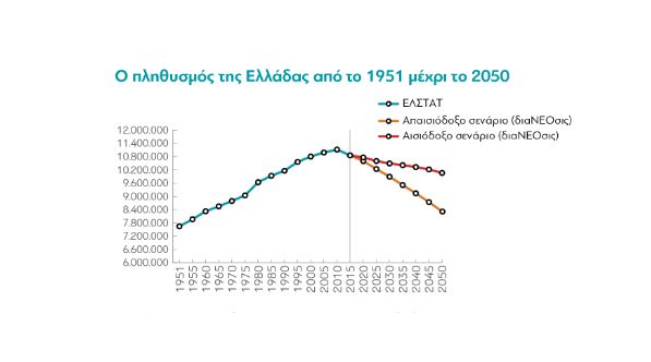 Από το 2011 και για πρώτη φορά μεταπολεμικά, ο πληθυσμός της Ελλάδας ξεκίνησε να μειώνεται με τους γηραιότερους να αυξάνονται. Άλλωστε δεν είναι καθόλου τυχαίο ότι σύμφωνα με πρόσφατη μελέτη της διαΝΕΟσις ο πληθυσμός της χώρας υπολογίζεται στα ανάμεσα στα 10 εκατ.(αισιόδοξο σενάριο) και τα 8,3 εκατ. (απαισιόδοξο σενάριο). Δίπλα στις προβλέψεις αυτές, έρχεται εκείνη της Eurostat, που κάνει λόγο για πληθυσμό 7,2 εκατομμυρίων το 2080.