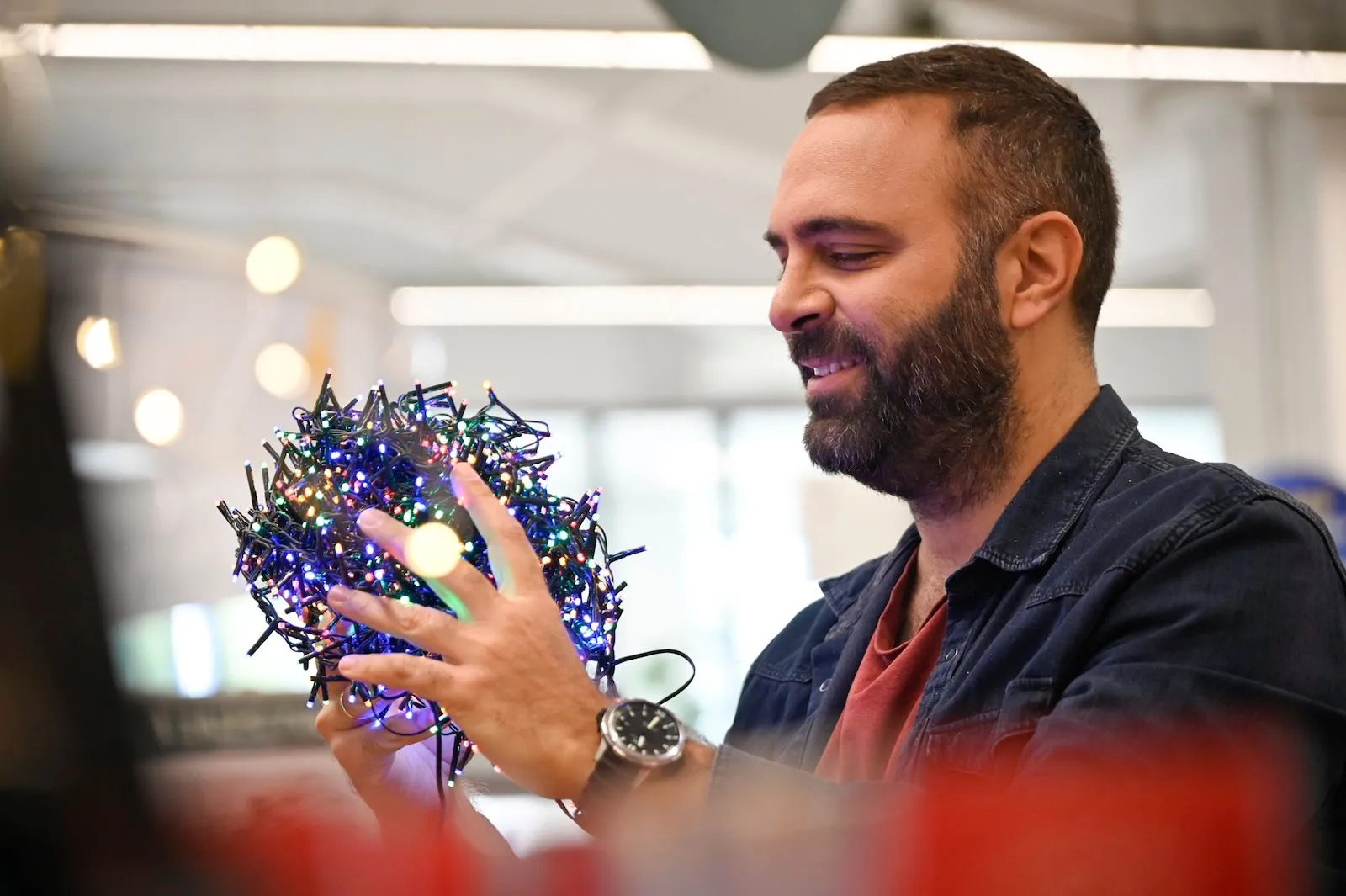 Παράλληλα, μου εξηγεί ότι, για εκείνον, το δέντρο δεν είναι απλώς διακόσμηση· είναι το κέντρο της γιορτής, το σημείο που μαζεύεται η οικογένεια κάθε απόγευμα του Δεκέμβρη. Και γι’ αυτό επενδύει σοβαρά στα σωστά λαμπάκια: να «αγκαλιάζουν» τον κορμό, να στροβιλίζονται γύρω από τα κλαδιά, να φωτίζουν κάθε επίπεδο του δέντρου. Στο τέλος, πάντα καταλήγει στο ίδιο συμπέρασμα: όποιο κι αν είναι το ύφος, όσο γεμάτο ή λιτό κι αν είναι το δέντρο, όλα ξεκινούν από το φως.