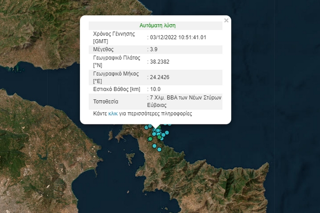 Δύο ασθενείς σεισμοί μεγέθους 3,9 βαθμών της κλίμακας Ρίχτερ σημειώθηκαν στις 12:35 και στις 12:51 νωρίς το μεσημέρι του Σαββάτου (3/12) στην ανατολική Εύβοια.