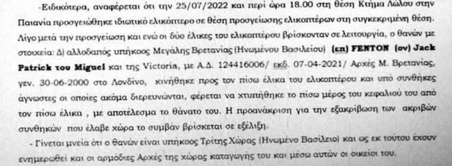 Την ίδια στιγμή στη δημοσιότητα δόθηκε το διαβιβαστικό της ΕΛ.ΑΣ. για το τραγικό συμβάν, τα αίτια του οποίου ερευνώνται.