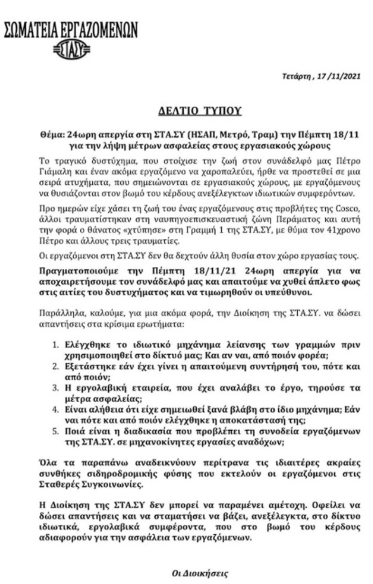 Οι εργαζόμενοι στη ΣΤΑ.ΣΥ δεν θα δεχτούν άλλη θυσία στον χώρο εργασίας τους. Πραγματοποιούμε την Πέμπτη 18/11/21 24ωρη απεργία για να αποχαιρετήσουμε τον συνάδελφό μας και απαιτούμε να χυθεί άπλετο φως στις αιτίες του δυστυχήματος και να τιμωρηθούν οι υπεύθυνοι.