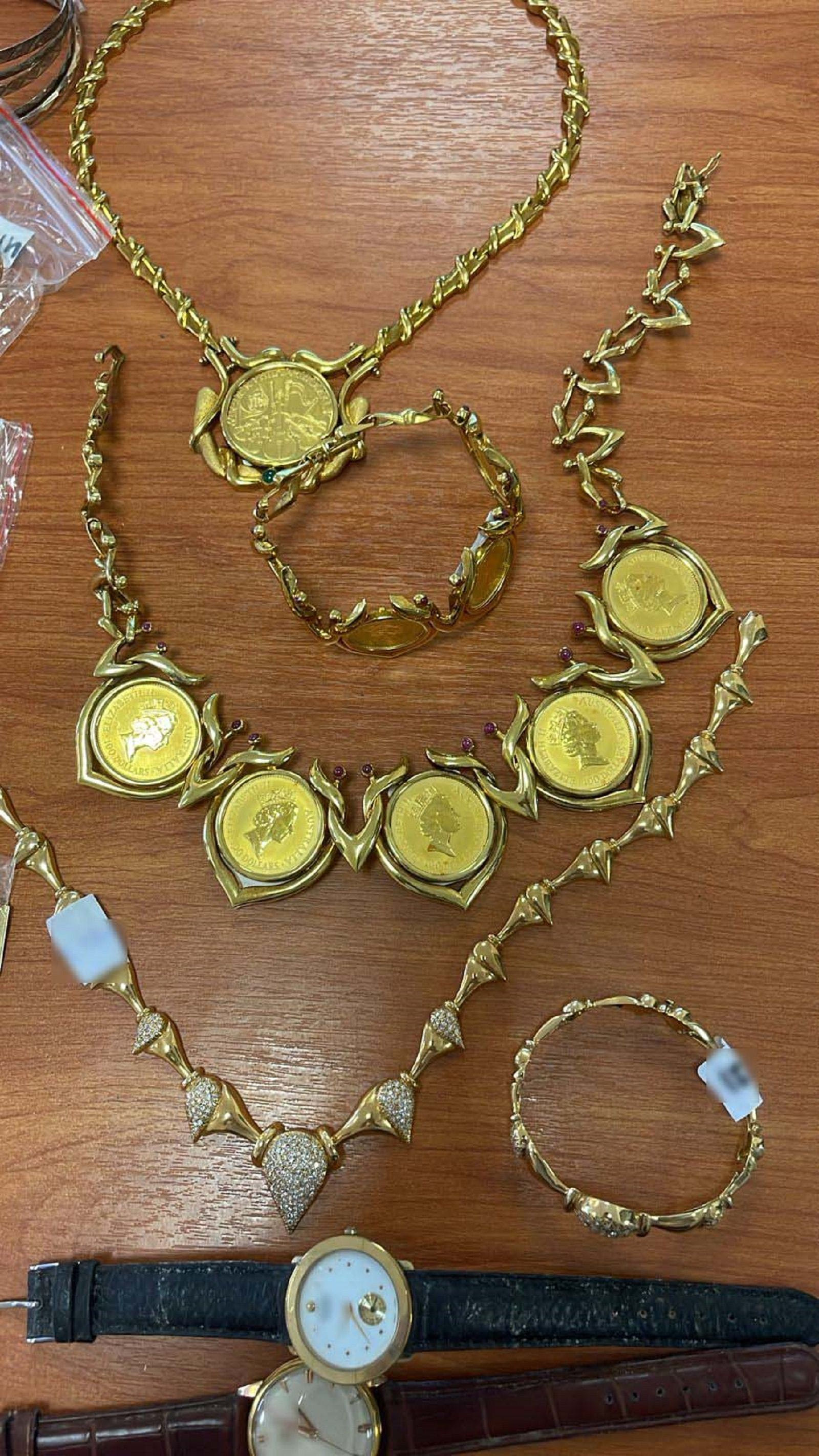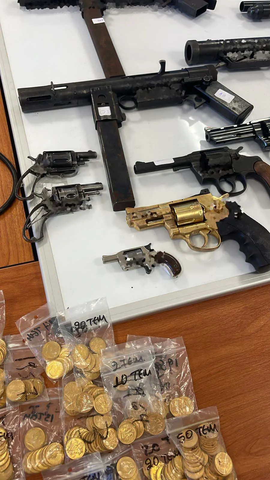 Επίσης, κατασχέθηκαν μηχανήματα αναγνώρισης μετάλλων, καταμετρητής χαρτονομισμάτων, 57 χρυσά νομίσματα, 510 λίρες Αγγλίας, αξίας περί τις 420.000 ευρώ, 2 Πεντόλιρα Αγγλίας, 2 Δίλιρα Αγγλίας, 35 μισόλιρα Αγγλίας, 5 ασημένια πιστά αντίγραφα αρχαίων ελληνικών νομισμάτων, 6 αρχαία νομίσματα, 45 αλυσίδες λαιμού και περιδέραια, 32 αλυσίδες, ταυτότητες και βραχιόλια χειρός, 28 μενταγιόν, 37 δαχτυλίδια, 13 σκουλαρίκια, 16 σταυροί, 3 καρφίτσες, 8 ρολόγια και καντράν ρολογιού, 23.320 ευρώ, μεγάλος αριθμός κερμάτων αξίας έκαστο 2 ευρώ, 11 συσκευές κινητών τηλεφώνων, 2 λαπτοπ, ειδικό μηχάνημα χάραξης (laser) χαρακτηριστικών σε σκληρά αντικείμενα που χρησιμοποιείτο για χαράξεις επωνυμιών και σειριακών αριθμών όπλων, συνοδευόμενο με υπολογιστή, GPS TRACKER και χειρόγραφες σημειώσεις. Οι συλληφθέντες θα οδηγηθούν στον αρμόδιο Εισαγγελέα.
