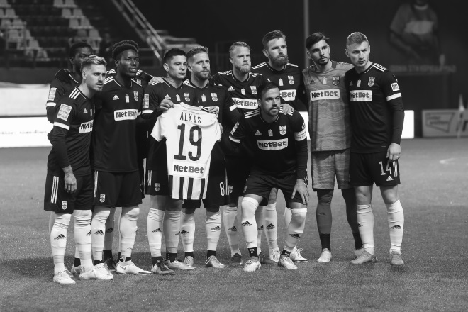 Με στεφάνια και λουλούδια οι παίκτες του Άρη και της ΑΕΚ τίμησαν τη μνήμη του Άλκη πριν από την έναρξη της μεταξύ τους αναμέτρησης. Το συγκινητικό μήνυμα στον πίνακα του Κλεάνθης Βικελίδης.