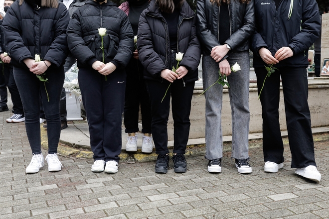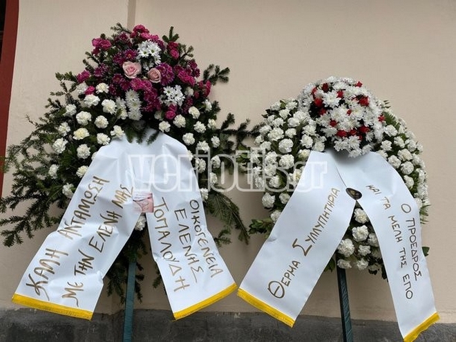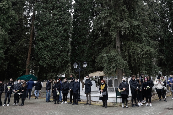 Με λευκά λουλούδια στα χέρια το τελευταίο αντίο στον 19χρονο Άλκη από συγγενείς και φίλους στο κοιμητήριο της Βέροιας. Στεφάνι έστειλε και η οικογένεια της Ελένης Τοπαλούδη.