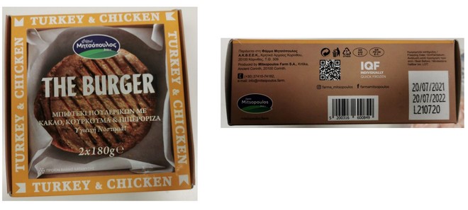 Ο Ε.Φ.Ε.Τ. και συγκεκριμένα η Περιφερειακή Διεύθυνση Αττικής, κατά τη διενέργεια ελέγχων στο πλαίσιο του Προγράμματος «Έλεγχος για Salmonella spp., Listeria monocytogenes και παρουσία σταφυλοκοκκικών τοξινών», προέβη σε δειγματοληψία τροφίμου με τα στοιχεία: «ΦΑΡΜΑ ΜΗΤΣΟΠΟΥΛΟΣ THE BURGER ΜΠΙΦΤΕΚΙ ΠΟΥΛΕΡΙΚΩΝ ΜΕ ΚΑΚΑΟ, ΚΟΥΡΚΟΥΜΑ & ΠΙΠΕΡΟΡΙΖΑ», με αριθμό παρτίδας L210720 και ημερομηνία ανάλωσης κατά προτίμηση πριν από 20-07-2022, καθαρού βάρους 2 X 180 γρ.