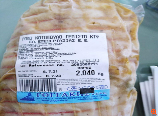 Α) “ρολό κοτόπουλο γεμιστό κτψ, Ελλην. Επεξεργασίας”, με ημερομηνία παραγωγής 6.7.21 και ημερομηνία ανάλωσης “κατά προτίμηση πριν από 6.7.23”, βάρους 2 kg περίπου.