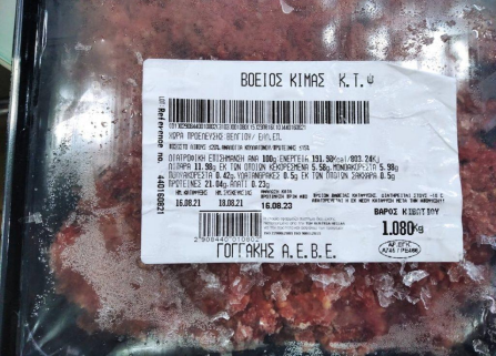 Β) “βόειος κιμάς κτψ, προέλευσης Βελγίου, Ελλην. επεξεργασίας”, με ημερομηνία συσκευασίας 18.08.21 και ημερομηνία ανάλωσης “κατά προτίμηση πριν από 16.08.23”, βάρους 1 kg περίπου.