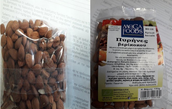 Α) το προϊόν με εμπορική ονομασία «Mega Foods Πυρήνες Βερίκοκου», βάρους 150g, παρτίδας 228241022 και ανάλωση κατά προτίμηση πριν από 31/12/23, το οποίο διακινήθηκε από την εταιρεία «ΒΙΟΥΓΕΙΑ Ε.Π.Ε.». Η επιχείρηση έχει ήδη προβεί στην ανάκληση του προϊόντος με ενδεικτικές φωτογραφίες όπως κατωτέρω: