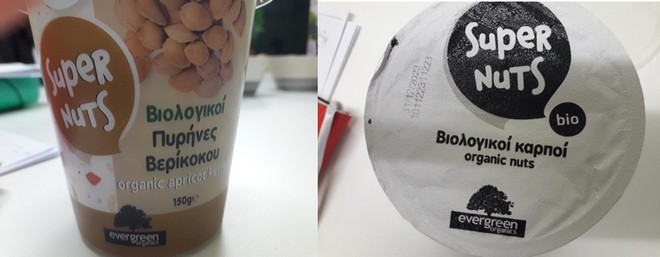 Β) το προϊόν με εμπορική ονομασία «Evergreen super nuts Βιολογικοί Πυρήνες Βερίκοκου», βάρους 150g, με παρτίδες 101122311223, 230922311223, 221022311223,190822311223, 020922311223, 181122311223 και 03122211223 και ανάλωση κατά προτίμηση πριν από 31/12/23, το οποίο διακινήθηκε από την εταιρεία «Αγροτική Βιοδιατροφική Α.Ε.». Η επιχείρηση έχει ήδη προβεί στην ανάκληση του προϊόντος με ενδεικτικές φωτογραφίες όπως κατωτέρω: